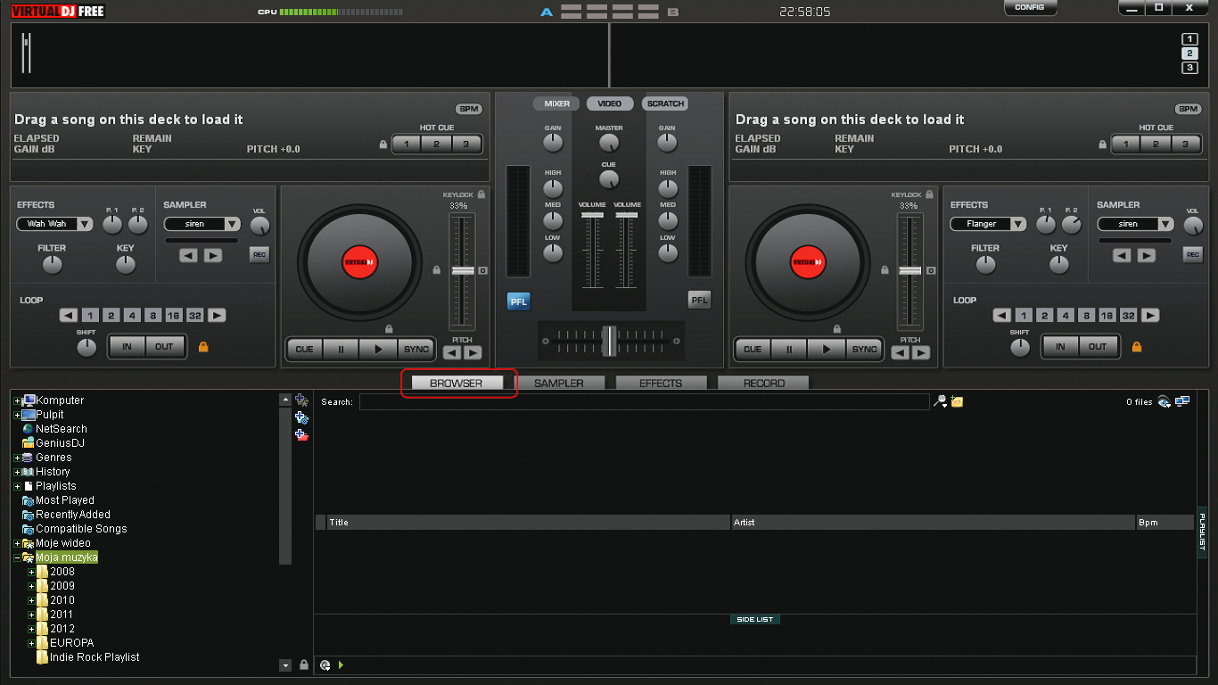 Virtual DJ po zainstalowaniu widzi wszystkie pliki muzyczne zmagazynowane na twoim dysku. Przykładowo, jeśli wcześniej archiwizowałeś je w folderze Moja muzyka, masz dostęp do zorganizowanej płytoteki, z której możesz do woli wybierać.