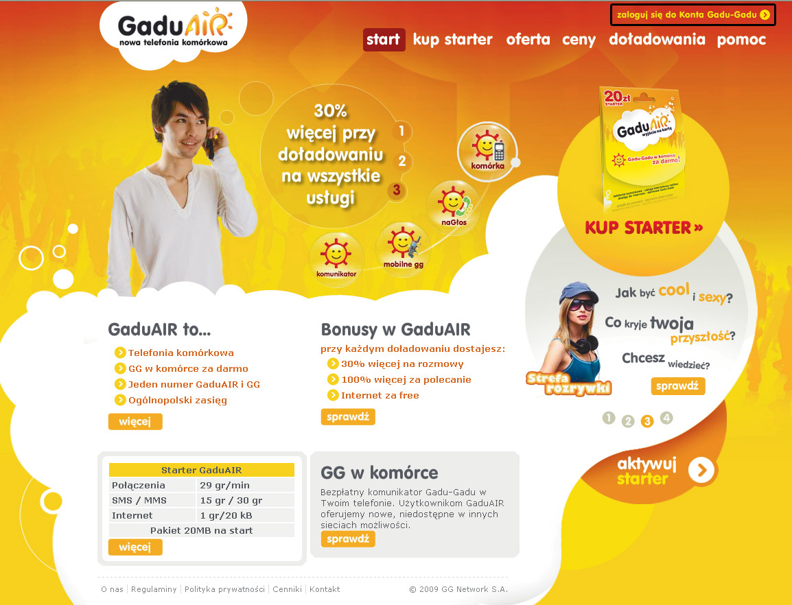 Starter telefonii komórkowej GaduAir (cena 20 zł) można zamówić na stronie operatora . Całą kwotę ze startera masz do wykorzystania na usługi. Ze starterem dostajesz dodatkowo bezpłatny pakiet internetowy 20 MB na transmisję danych.