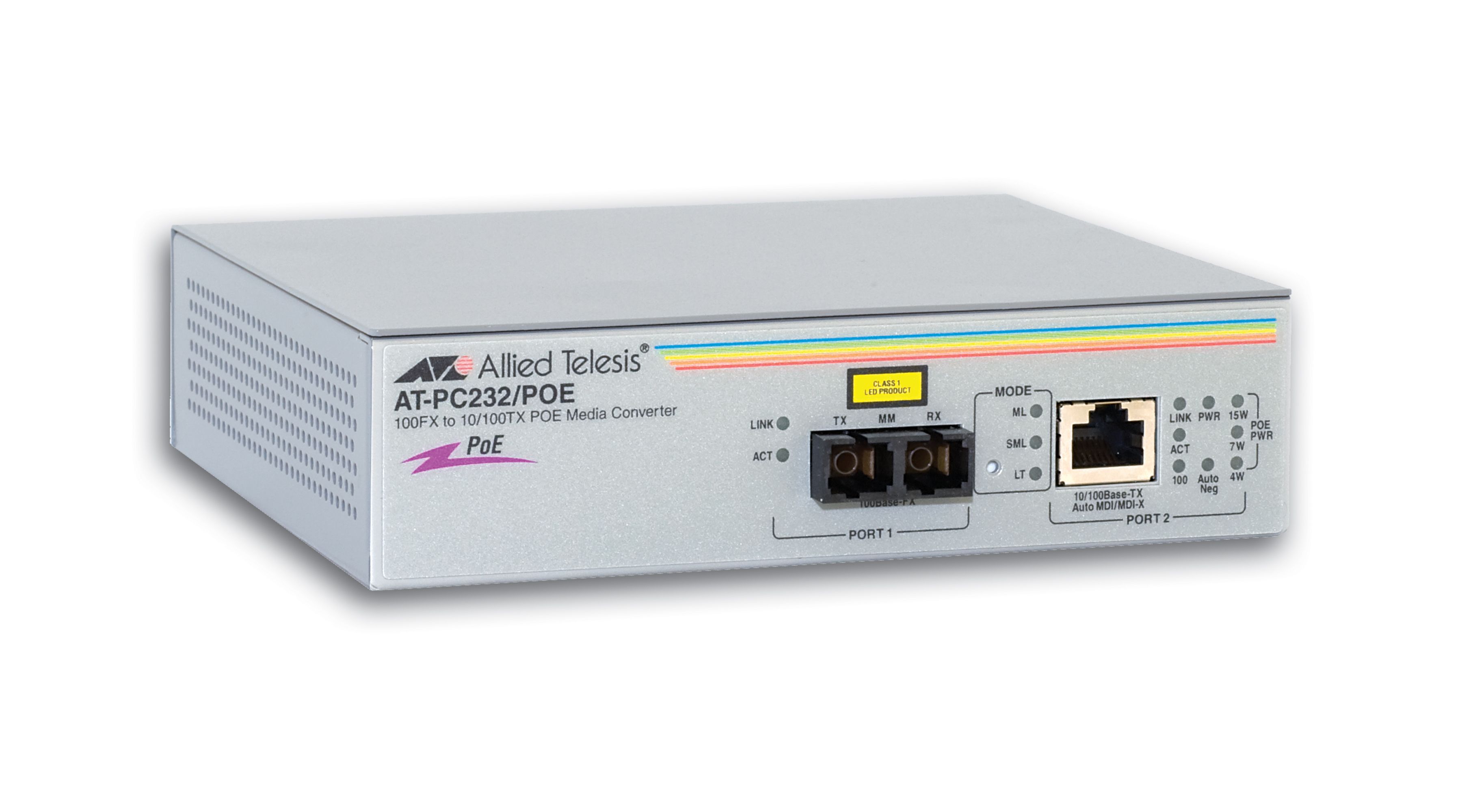 Urządzenie wyposażono w port światłowodowy 100FX i miedziany 10/100TX. Port optyczny ma wejście SC, które umożliwia transmisję na odległość 2 kilometrów za pośrednictwem kabla wielomodowego. Z kolei jego miedziany odpowiednik ze złączem RJ-45, pozwala na przesyłanie danych na dystansie do 100 metrów. Oprócz przekazywania danych, port jest także źródłem zdalnego zasilania innych urządzeń. Model AT-PC232/POE może im dostarczyć 15,4 W mocy. Specjaliści Allied Telesis zadbali, aby wspierane były wszystkie urządzenia zgodne z normą IEEE 802.3af.