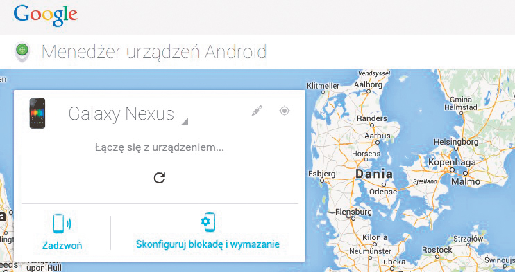 Aby znaleźć smartfona, otwórz w przeglądarce stronę internetową www.google.com/android/devicemanager i zaloguj się do swojego konta Google (tego, które jest używane w telefonie). Okienko w lewym górnym rogu ekranu zawiera nazwę twojego urządzenia, np. Galaxy Nexus. Jeśli z kontem Google masz połączone kilka urządzeń, kliknij wyświetloną nazwę i wybierz właściwe z listy, np. MyPhone Cube.