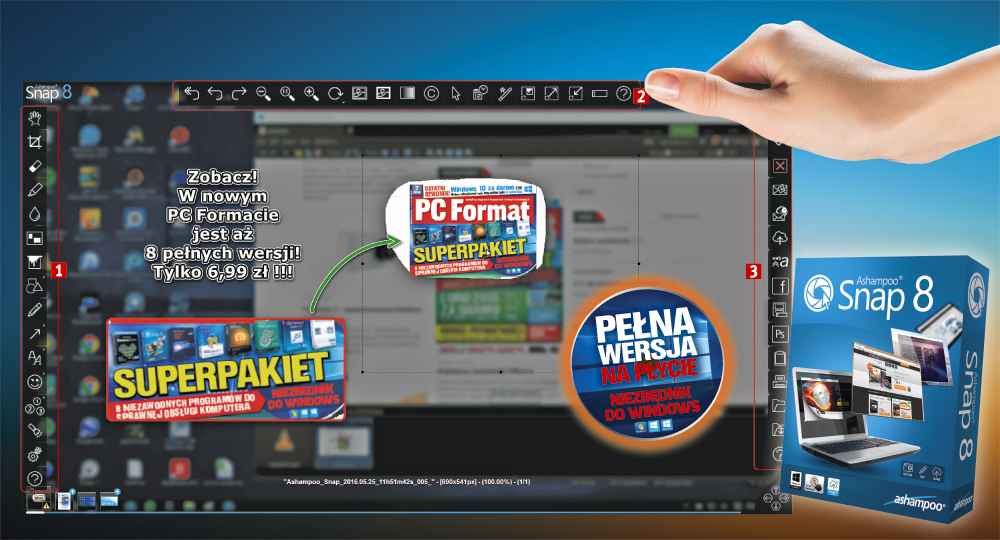 Program Snap 8 oferuje wszystko, czego potrzebujesz do przechwytywania grafiki, dodawania adnotacji i efektów do zapisanego materiału oraz do jego publikacji. Przechwytywany może być fragment ekranu o dowolnym kształcie, następnie możesz go zmodyfikować, powiększyć, obrócić lub uzupełnić np. o cienie, strzałki i podpisy. Snap pozwoli tworzyć samouczki lub grafikę np. na strony WWW lub do szkolnych projektów.