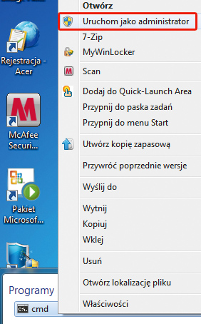 Rozwiń menu Start, w polu wyszukiwania wpisz cmd, a następnie kliknij prawym klawiszem wyświetloną pozycję cmd i z menu kontekstowego wybierz polecenie Uruchom jako administrator.