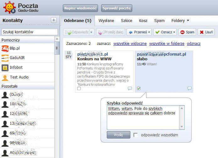 Dostępne opcje nie są zbyt rozbudowane, ale wystarczają do realizowania podstawowych zadań. Na uwagę zasługuje opcja szybkiej odpowiedzi. Pole tekstowe jest wyświetlane w formie chmurki i umożliwia naprawdę błyskawiczne odpisywanie na e-maile. Użytkowników Gadu-Gadu ucieszy również fakt, że z poczty można korzystać także bezpośrednio z komunikatora. W wersji 10. tego programu dodano zakładkę poczty.