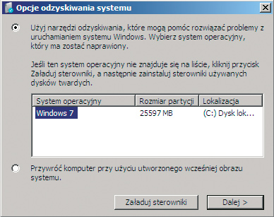 Uruchom komputer z płyty instalacyjnej, przejdź pierwszy ekran kreatora z wyborem języka oraz klawiatury i na kolejnym wybierz opcję naprawy, klikając Napraw komputer. W kolejnym oknie zaznacz pole Użyj narzędzi odzyskiwania… i kliknij Dalej.