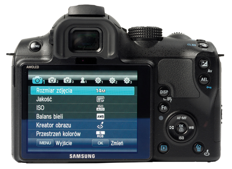 Nieco inaczej wygląda konstrukcja Samsunga. Aparat oznaczony symbolem NX10 wygląda bardziej jak miniaturowa lustrzanka. Ma korpus zdecydowanie większy niż NEX-5, jednak mniejszy od typowej lustrzanki.
