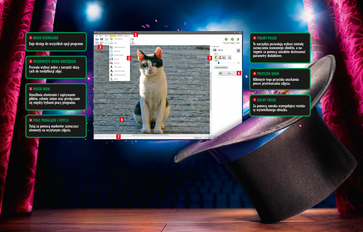 Gdy zaznaczysz już obiekt oraz tło, kliknij przycisk Usuń. Z obrazka wymazane zostanie tło – widoczny pozostanie tylko wyodrębniony na początku kot.
