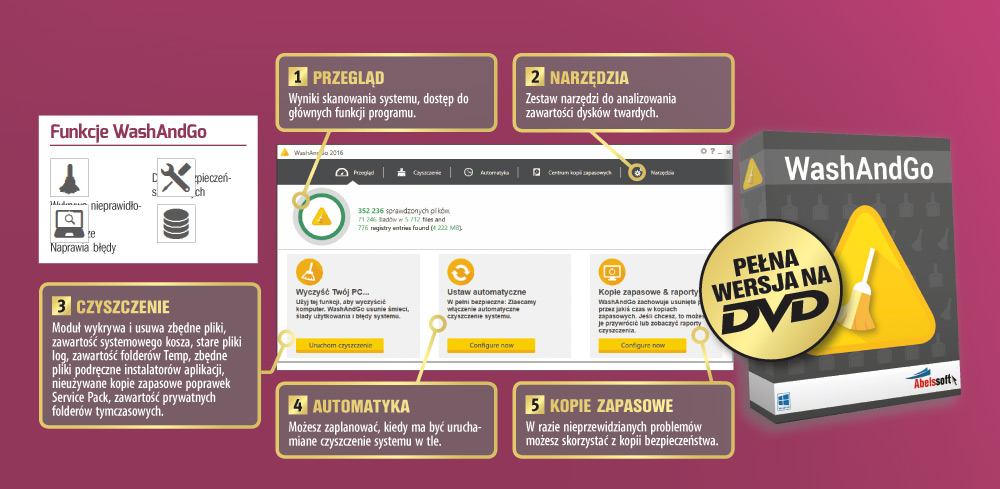 Program WashAndGo 2016 jest wirtualną miotłą przeznaczoną do usuwania z dysków zbędnych plików i poufnych informacji oraz do naprawiania błędów systemowych. Proces czyszczenia przebiega automatycznie bez niepokojenia użytkownika.