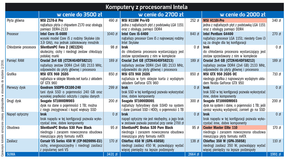 Od kilku miesięcy obowiązującą platformę Intela dla komputerów stacjonarnych tworzą podstawka LGA 1151, płyty z chipsetami H110, B150, H170 i Z170, pamięci DDR4, i procesory Skylake. Wszystkie nasze konfiguracje wykorzystują taki zestaw komponentów.