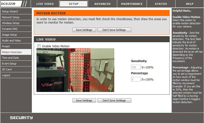 Przydatną funkcją jest wykrywanie ruchu. Użytkownik zaznacza na obrazie, które strefy mają być uwzględnione podczas analizy ruchu. Gdy we wskazanym obszarze coś się poruszy, kamera rozpoczyna nagrywanie. Oczywiście, gdy jest całkiem ciemno, funkcja nie działa. Dlatego przydatnym dodatkiem jest lampa podczerwieni, która nie świeci zbyt jasno, ale na tyle skutecznie, by kamera wykryła ruch w ciemności.