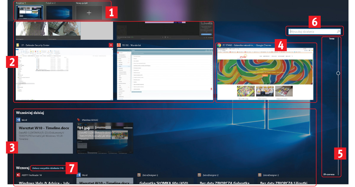 Oś czasu w Windows 10 to funkcja, która ułatwia organizację pracy. Rejestruje ona w postaci tak zwanych aktywności wszystko, czym zajmował się użytkownik. Zapisuje uruchomione programy oraz edytowaną w nich zawartość. Archiwizuje informacje z ostatnich dni i tygodni. Za pomocą osi można otworzyć stronę przeglądaną trzy dni wcześniej albo wyświetlić dokument edytowany w ubiegłym tygodniu.