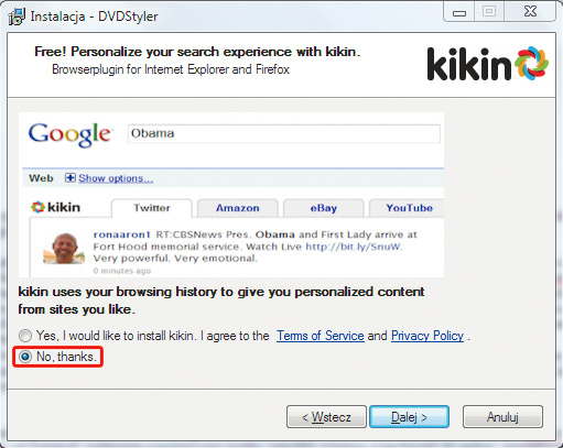 Instalacja programu DVDStyler jest wykonywana standardowo za pomocą kreatora. Zwracamy jednak uwagę na etap instalacji, w której jesteśmy namawiani do instalacji zbędnego dodatku do przeglądarek internetowych o nazwie kikin. Należy wybrać opcję No, thanks. Dalsza część instalacji nie wymaga już interwencji użytkownika. Program zostanie uruchomiony automatycznie po zakończeniu instalacji.