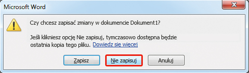 Podczas zamykania dokumentu (nawet nigdy niezapisanego), nad którym pracowaliśmy dłużej niż 10 minut (domyślne ustawienie funkcji automatycznego odzyskiwania jest takie, że kopia aktualnie edytowanego dokumentu jest zapisywana co 10 minut), wyświetlane jest okno dialogowe – takie, jak na ilustracji. Wyraźnie jest widoczny komunikat, że nawet jeśli klikniesz przycisk Nie zapisuj, program przechowa ostatnią tymczasową kopię zamykanego dokumentu. Wyjaśniamy, jak ją odzyskać.
