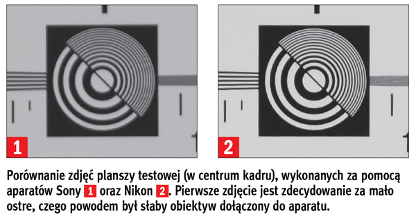 Oba aparaty testowaliśmy razem ze sprzedawanymi z nimi obiektywami (tzw. kitowymi) 18–55 mm. Pierwsze wrażenia są lepsze w przypadku zestawu Sony niż Nikona. Mechanizm autofokusa działa bardzo szybko, aparat robi doskonałe zdjęcia. Okazało się jednak, że obiektyw Sony ma pewną wadę – przy wzroście ogniskowej (większym zoomie) bardzo spada ostrość w centrum kadru. Ponadto pierścień zmiany ogniskowej w tym zakresie pracuje nieco za ciężko, więc podczas filmowania trudno uzyskać płynne zbliżenie. Może to być jednak wada pojedynczego egzemplarza obiektywu.
