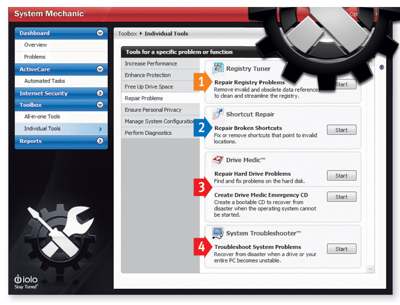 Z menu Toolbox wybierz opcję Individual Tools. Następnie, z kolejnego menu, które się wyświetli obok, wybierz opcję Repair Problems. W zestawie narzędzi wyświetlonym po prawej stronie kliknij przycisk Start widoczny przy narzędziu System Troubleshooter.