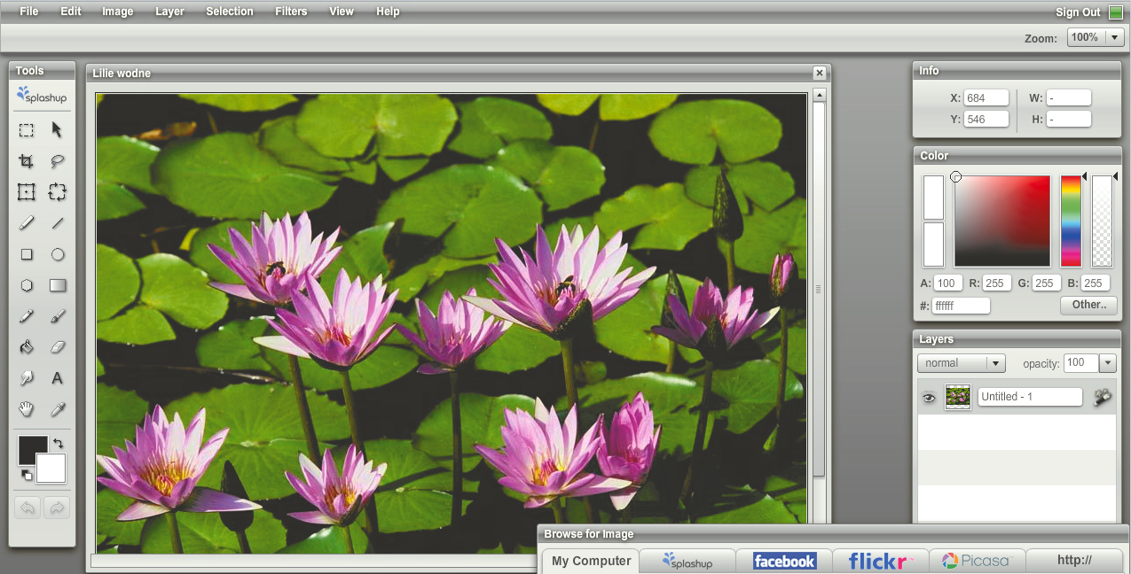 Splashup (dawniej fauxto) to próba stworzenia Photoshopa w trybie online. Dostęp do programu uzyskujesz po darmowej rejestracji. Serwis umożliwia edytowanie fotografii, które możesz wgrywać z różnych źródeł (dysk twardy, Picasa, flickr). Dzięki temu wystarczy komputer z dostępem do internetu, aby w każdej chwili opracowywać grafiki przetrzymywane w popularnych serwisach. Aplikacja umożliwia edycję zdjęć w tak popularnych formatach, jak JPG, PNG, TIF czy GIF. Serwis pozwala na pracę na warstwach i oddaje użytkownikowi szereg narzędzi, od podstawowych funkcji, takich jak kadrowanie, wyostrzenie czy rozmycie, po kilkanaście filtrów do bardziej zaawansowanej obróbki.