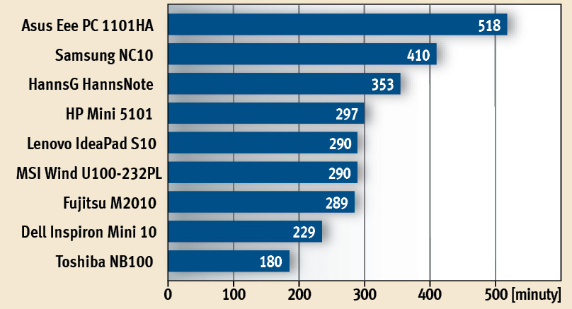 Atutem jest na pewno długi czas pracy na baterii. Pod tym względem na uwagę zasługuje przede wszystkim Asus EeePC 1101HA, który ma najdłuższy czas pracy przy obciążeniu wynoszącym 6 godzin, a bez obciążenia niemal 9 godzin! Oczywiście nie każdy netbook będzie miał takie osiągi, co widać na powyższym wykresie.