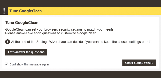 Po uruchomieniu wyświetli się okno powitalne, które możesz na razie zamknąć. Zaznacz pole Don't show this message again i kliknij Close Setting Wizard. Wyświetli się okno główne programu GoogleClean. W górnej części widoczny jest pasek zawierający ikony, które dają dostęp do opcji konfigurujących poszczególne aplikacje Google zainstalowane w systemie.