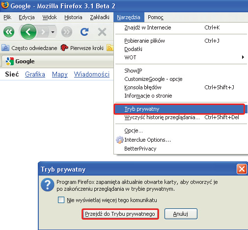 W przeglądarce Firefox tryb prywatny miał się pojawić już w wersji 3.0, jednak programiści z grupy Mozilla zaimplementowali funkcje dopiero w testowym wydaniu 3.1. Jest to wersja beta, z której korzystamy na własną odpowiedzialność. Aplikację możesz pobrać ze strony http://releases.mozilla.org/pub/mozilla.org/firefox/releases/.