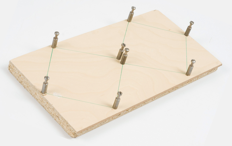 Przygotuj deskę o wymiarach 15×30 cm. Narysuj na niej dwa kwadraty o bokach 10 cm, stykające się wierzchołkami. W miejscach wierzchołków wkręć wkręty w sposób pokazany na zdjęciu.