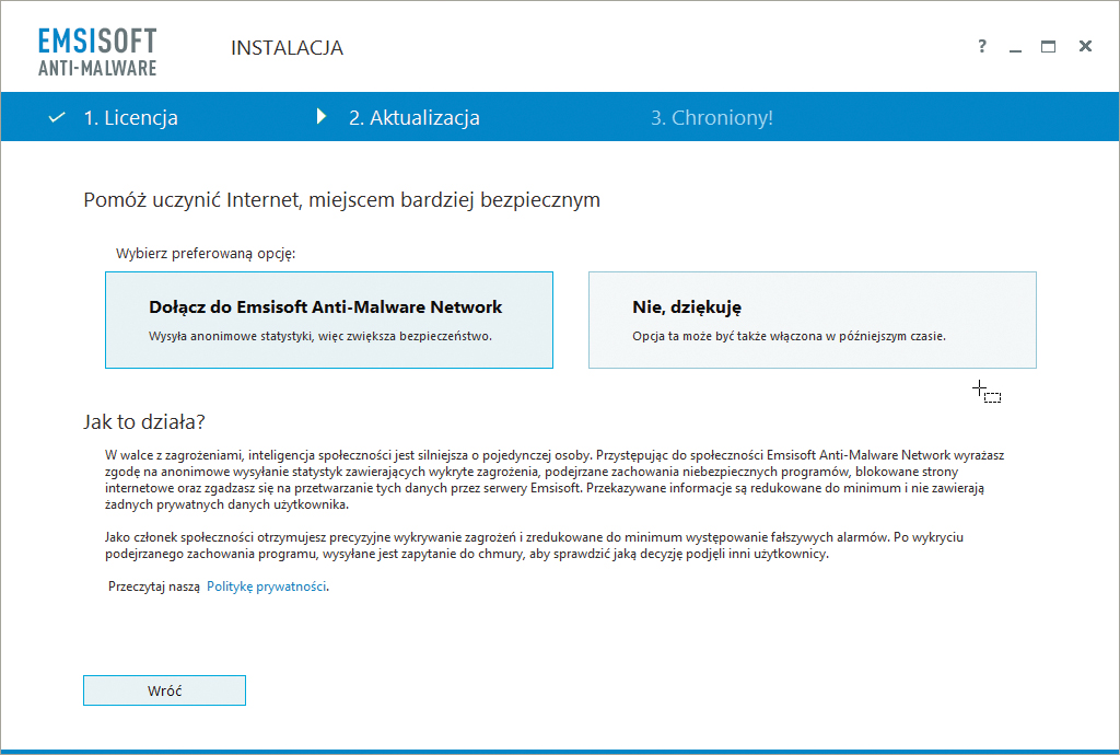 Po zakończeniu aktualizowania kliknij przycisk Dalej. Wyświetli się plansza, na której możesz włączyć wykrywanie potencjalnie niepożądanych programów. Kliknij Włącz wykrywanie PNP.