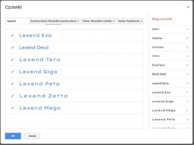 Czcionka występuje w siedmiu wariantach. Aby z niej skorzystać, należy rozwinąć listę Czcionki na pasku narzędzi Dokumentów Google’a, wybrać opcję Więcej czcionek i w polu wyszukiwania wpisać frazę Lexend. Po wybraniu odpowiedniej wersji kroju liter i kliknięciu przycisku OK font pojawi się na liście czcionek w Dokumentach, Arkuszach i Prezentacjach Google’a.