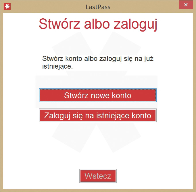 Po skonfigurowaniu programu dla obecnych w systemie przeglądarek internetowych – co przebiegnie automatycznie – LastPass wyświetli okno logowania. Jeżeli masz już konto użytkownika, np. stworzone podczas korzystania z poprzedniej wersji programu, kliknij Zaloguj się na istniejące konto. W przeciwnym razie użyj przycisku Stwórz nowe konto.