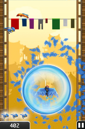Prosta zręcznościówka, której zasady rozgrywki są zawarte w tytule – gracz steruje ninją skaczącym między dwoma pionowymi ścianami budynku. Celem gry jest omijanie fruwających przeszkód lub zbieranie ich w trakcie skoku – zebranie trzech z rzędu przeszkód tego samego rodzaju daje chwilowe przyspieszenie lub inny bonus. Natrafienie na przeszkodę oznacza odpadnięcie od ściany i konieczność rozpoczęcia rozgrywki od początku. W pokonywaniu kolejnych metrów pomaga pole siłowe.