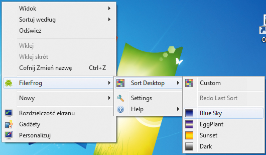 Chcąc uporządkować ikony na pulpicie, kliknij w dowolnym miejscu pulpitu prawym klawiszem myszki i z menu kontekstowego wybierz kolejno: FilerFrog, Sort Desktop, a następnie jeden z czterech predefiniowanych szablonów uporządkowania, na przykład Blue Sky.