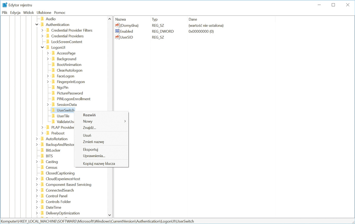 Wciśnij kombinację klawiszy Win+R, wpisz polecenie regedit i wciśnij Enter. Po uruchomieniu Edytora rejestru rozwiń kolejno następujące klucze: HKEY_LOCAL_MACHINE, SOFTWARE, Microsoft, Windows, CurrentVersion, Authentication, LogonUI. Kliknij prawym przyciskiem myszy klucz UserSwitch i z menu kontekstowego wybierz Uprawnienia.