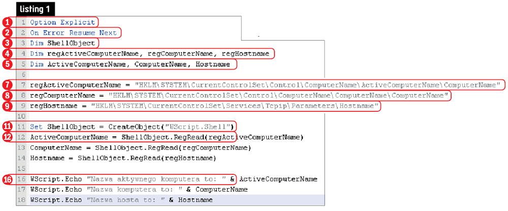 W linii 16 ponownie pojawi się, tym razem już wywoływany bezpośrednio (a nie poprzez wcześniej zadeklarowaną zmienną), obiekt WScript. Tym razem, w celu wyświetlenia informacji na ekranie, używasz metody Echo. Najpierw wyświetlana jest wartość przechowywana przez zmienną ActiveComputerName (odczytana z rejestru w linii 12), a następnie – po znaku łącznika – informacja tekstowa zawarta w cudzysłowach.