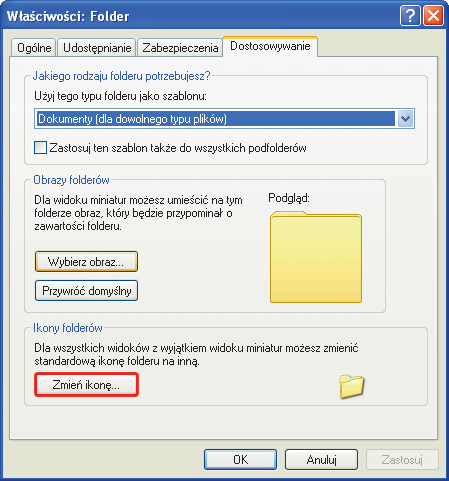 W oknie właściwości foldera przejdź do zakładki Dostosowywanie, pod którą, w sekcji Ikony folderów kliknij przycisk Zmień ikonę. Zwróć uwagę, że po prawej stronie tej sekcji jest wyświetlany aktualny obraz ikony foldera.