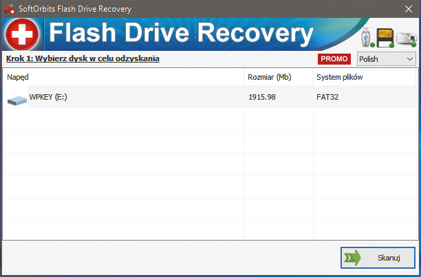 Wybierz z listy pamięć USB, z której przypadkowo skasowano pliki, po czym uruchom skaner.