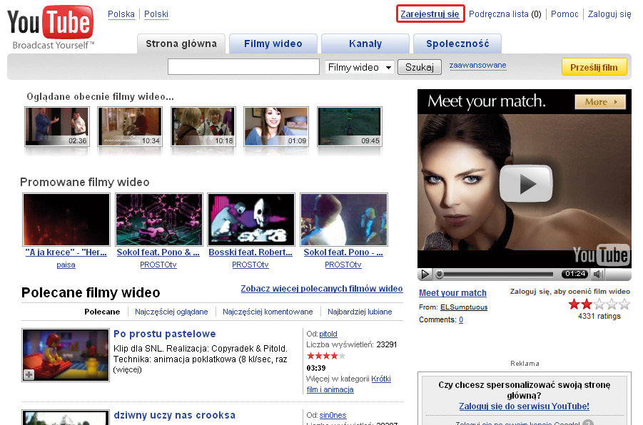 W pasku adresowym przeglądarki wpisz adres polskojęzycznej wersji serwisu http://pl.youtube.com/. Następnie kliknij odsyłacz Zarejestruj się.