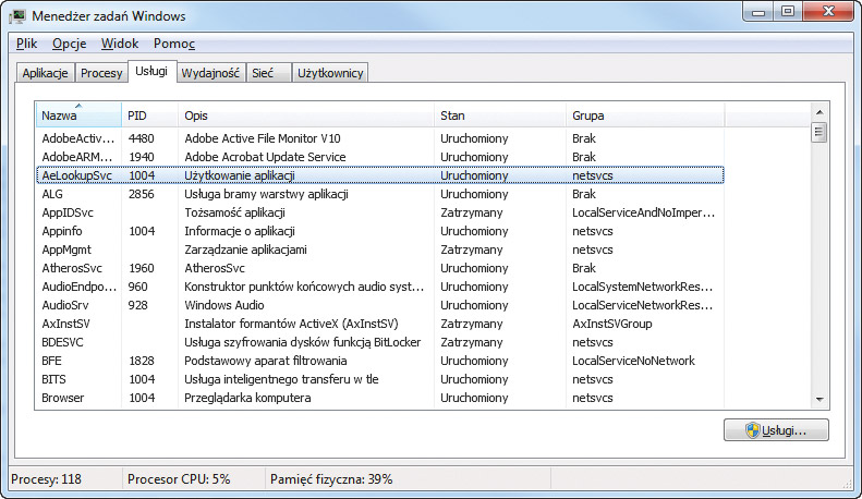 Za pomocą skrótu [Ctrl]+[Shift]+[Esc] uruchomisz Menedżera zadań Windows. Po wywołaniu okna Menedżera zadań kliknij kartę Usługi. Zobaczysz tabelę wszystkich usług dostępnych w twoim systemie, zarówno tych uruchomionych (zajmujących pamięć i czas procesora), jak i zatrzymanych (niewykorzystujących żadnych zasobów). Informacja o tym, czy dana usługa działa, jest widoczna w kolumnie Stan.
