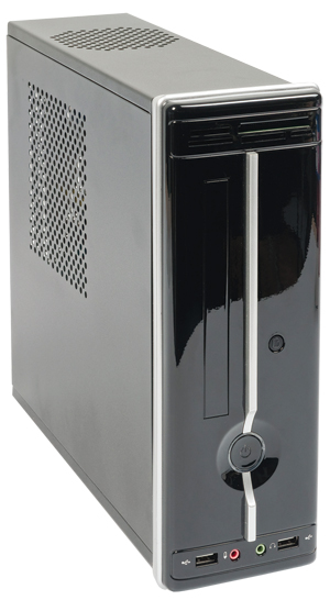 Oprócz płyty mITX do obudowy zmieści się także standardowy dysk 3,5”, napęd optyczny typu slim (taki, jak do notebooków) oraz jedna niskoprofilowa karta rozszerzeń. W wyposażeniu obudowy jest zasilacz 200 W, a na przednim panelu czytnik kart pamięci.