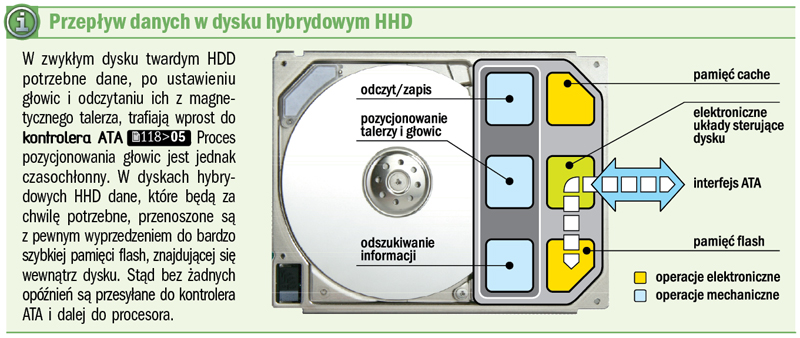W ostatnim numerze PC Formatu opisaliśmy dyski SSD (Solid State Disk) , które do przechowywania danych wykorzystują pamięci flash zamiast tradycyjnych talerzy pokrytych materiałem magnetycznym (artykuł zamieszczamy na CD). Dyski SSD mają liczne zalety, ale są jeszcze bardzo drogie. Postanowiono więc połączyć w jednym urządzeniu zalety napędu SSD z przystępną ceną dysku twardego. Jednym z pierwszych producentów, którzy wpadli na ten pomysł, był Samsung. W 2006 roku na konferencji WinHEC (Windows Hardware Engineering Conference) w Seattle zaprezentował prototypy dysków twardych z wbudowaną pamięcią flash o pojemności 128 i 256 MB. Zostały one nazwane dyskami hybrydowymi HHD (Hybrid Hard Drive).