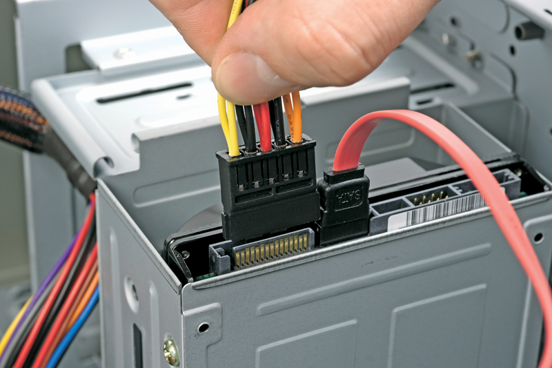 Zniknięcie dysku z systemu zazwyczaj jest następstwem awarii – samego dysku lub kabli. Najprostszą czynnością, jaką można wykonać w wypadku peceta, jest wymiana kabelka SATA i podłączenie innej wtyczki zasilającej. Jeśli to nie pomoże, można podłączyć dysk do innego portu SATA płyty głównej.