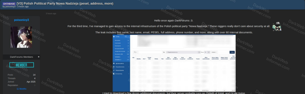 Nowa Nadzieja (NN), partia polityczna powstała na bazie założonego w 2015 roku ugrupowania KORWiN, podobno padła ofiarą włamu ze strony jednej z grup cyberprzestępców. Do ataku przyznał się haker (lub hakerzy) działający pod pseudonimem poisonivy3, a liczne informacje skradzione z serwerów zostały opublikowane na jednym z forów. Jak podkreślił Dark Web Informer, jest już to trzeci tego typu incydent z udziałem Nowej Nadziei.
