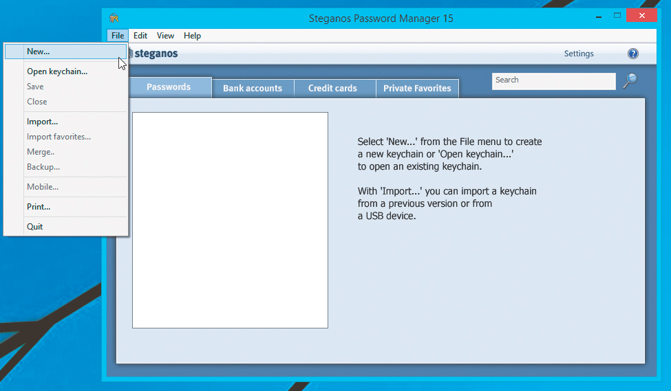 Po uruchomieniu programu wyświetli się okno z wybraną zakładką Passwords. Aby utworzyć chronioną bazę danych, z menu File wybierz opcję New.