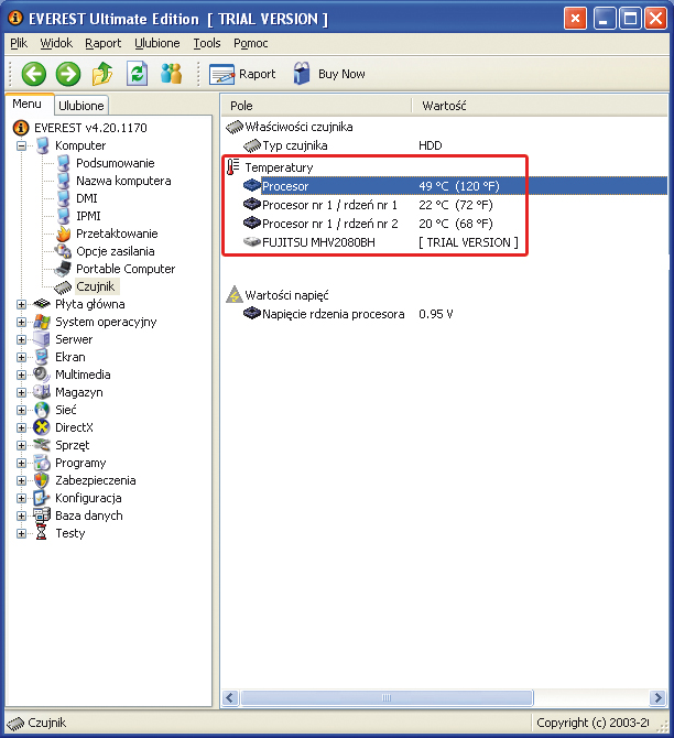 W lewej części okna rozwiń gałąź Komputer, kliknij i sprawdź temperaturę procesora. W spoczynku, gdy procesor nie jest obciążony, nie powinna przekraczać 30–40 stopni, jedynie w przypadku starych procesorów Intel Pentium 4 może być nieco wyższa. Zbyt wysoka prawie na pewno świadczy o niesprawnym chłodzeniu procesora lub całego wnętrza obudowy.