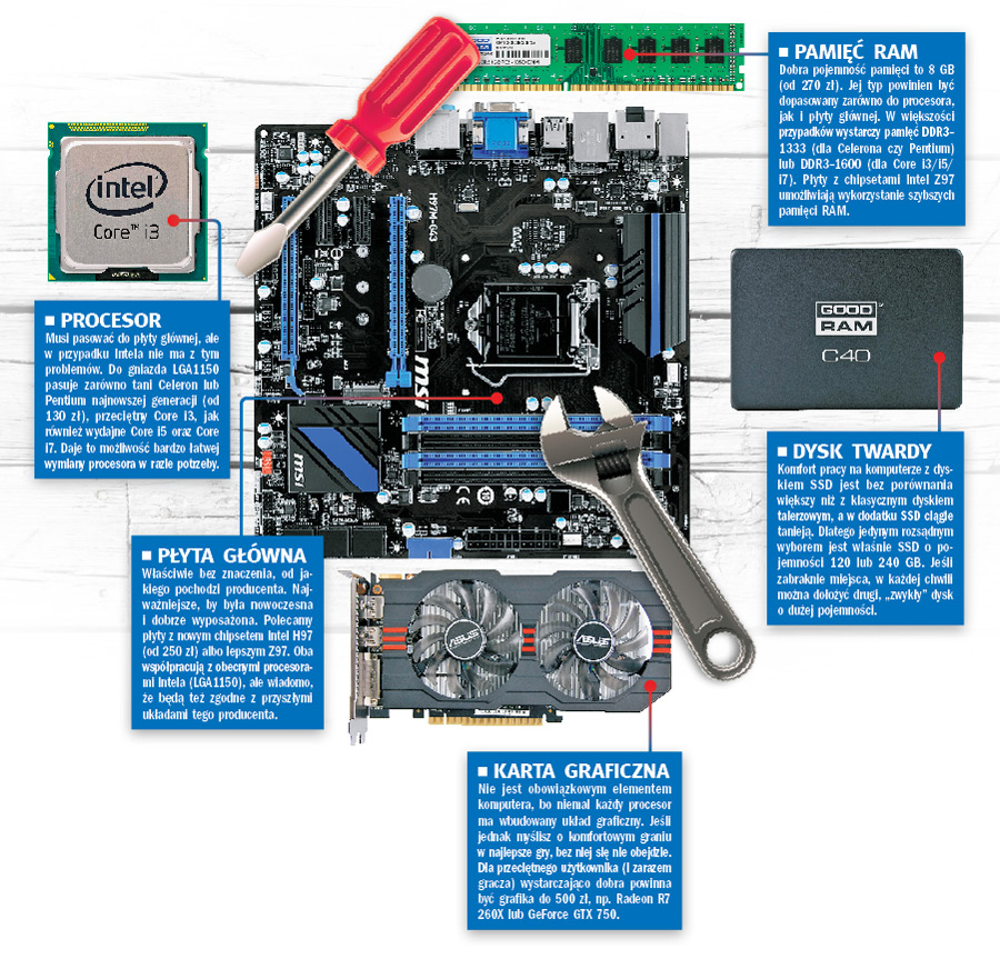 Do wybranych płyt gównych będą pasowały wszystkie obecne procesory Intela czwartej generacji – od najtańszego Celerona G1820 (za około 130 zł), przez Pentium (190–350 zł), Core i3 (400–600 zł), Core i5 (630–1000 zł), aż po najlepsze układy Core i7 (1000–1260 zł). Celeron i Pentium to układy do codziennego użytku, ale niekoniecznie do gier, bo nie mają kilku technik spotykanych w lepszych modelach. Optymalny współczynnik wydajności do ceny zapewnia dwurdzeniowy Core i3, choćby model 4130 za około 400 zł.