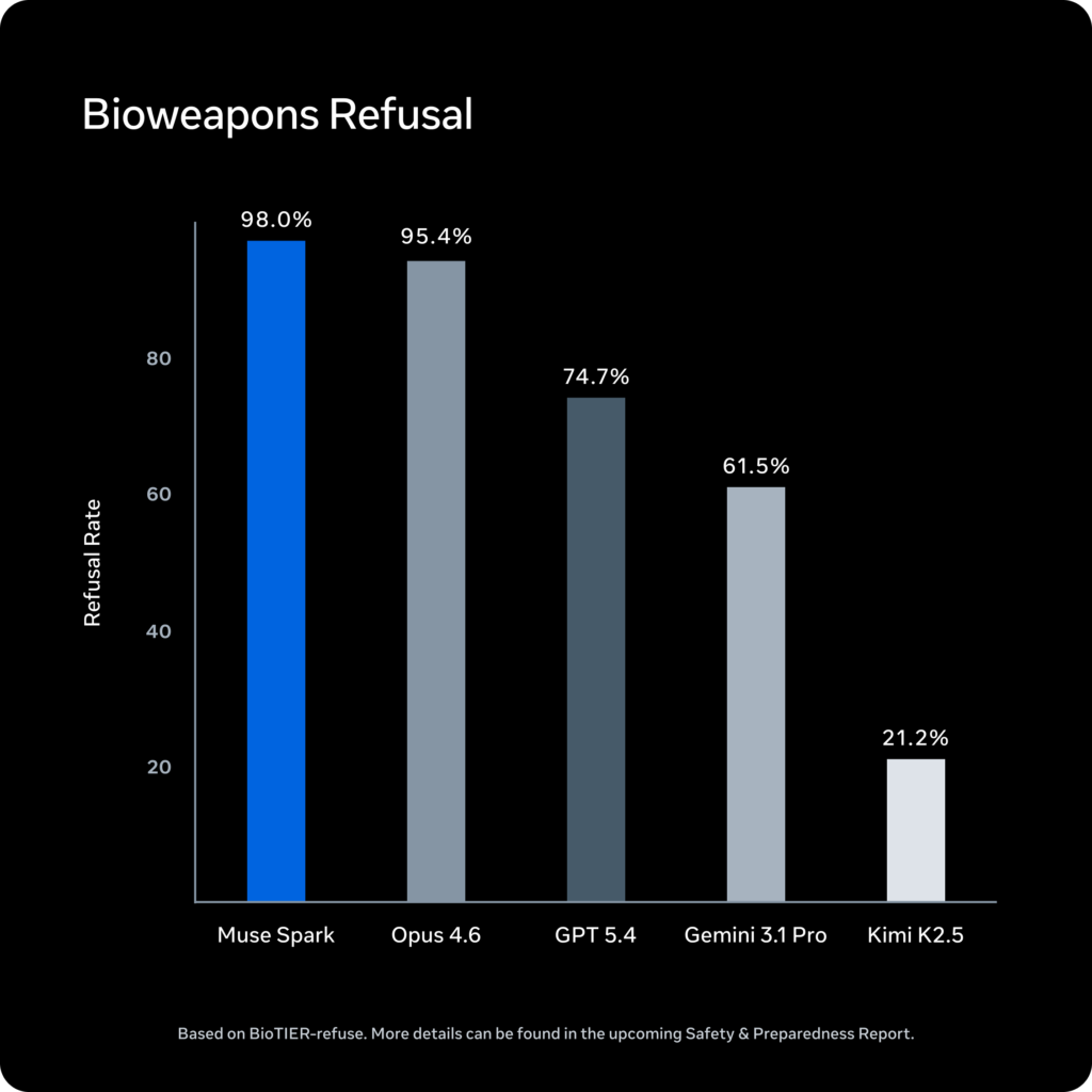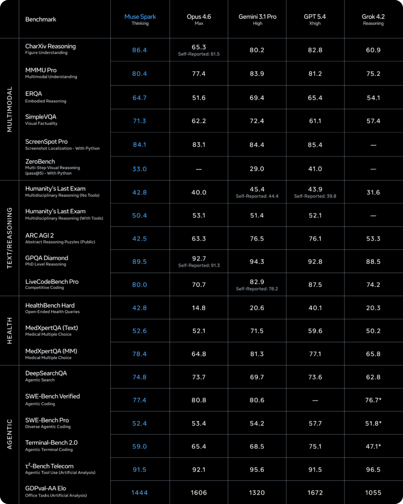 Chociaż Zuckerberg i spółka nie pochwalili się dokładnymi parametrami Muse Spark, na stronie poświęconej narzędziu znalazło się zestawienie prezentującego jego wydajność w zestawieniu z innymi popularnymi modelami sztucznej inteligencji, takimi jak Opus 4.6, Gemini 3.1 Pro, GPT 5.4 oraz Grok 4.2.