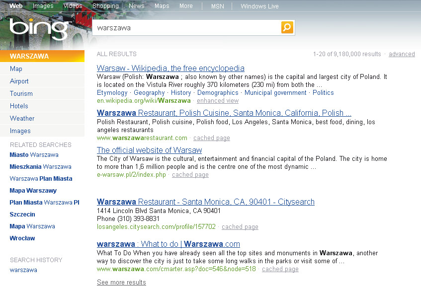 Niestety, wyszukiwarka w polskiej wersji językowej nie jest wyposażona we wszystkie funkcje, które ma jej amerykański odpowiednik. Jednak brakujące opcje mają się pojawiać regularnie. Być może za kilka dni informacje o funkcjach dostępnych tylko za oceanem okażą się już nieaktualne, ponieważ Microsoft wprowadzi je w międzyczasie do polskiej edycji.