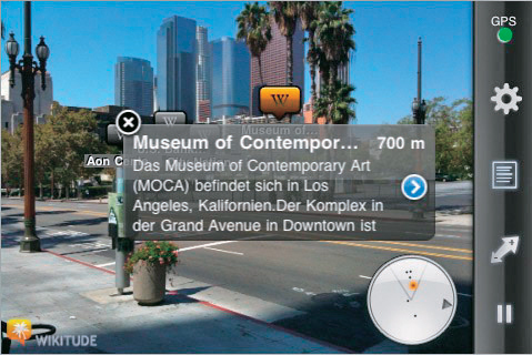 Wikitude to jedna z najstarszych i jednocześnie najpopularniejszych aplikacji rozszerzonej rzeczywistości. Jej zaletą jest nie tylko efektowny sposób nanoszenia informacji na obraz z kamery, ale też baza danych, która liczy ok. 100 mln miejsc i materiałów interaktywnych. Jest to możliwe dzięki otwartemu API. Każdy może przygotować własną warstwę informacyjną, tzw. świat. W programie jest ich ok. 3000. Po uruchomieniu aplikacji zobaczysz listę polecanych warstw. Najlepiej uruchomić pierwszą – Wokół mnie, która prezentuje punkty z różnych źródeł znajdujące się w pobliżu lokalizacji użytkownika. Pozostałe warstwy znajdziesz w katalogu dostępnym w aplikacji mobilnej albo w wyszukiwarce. W katalogu jest m.in. ciekawa warstwa informacyjna, która pozwala wyświetlać zdjęcia i położenie znajomych z Facebooka. Są też otagowane geograficznie artykuły z Wikipedii oraz punkty pobrane z serwisów Yelp i Foursquare polecających restauracje i inne usługi. Oprócz podstawowego widoku rozszerzonej rzeczywistości można także wyświetlać pobliskie miejsca w postaci listy oraz na podkładzie z Map Google.