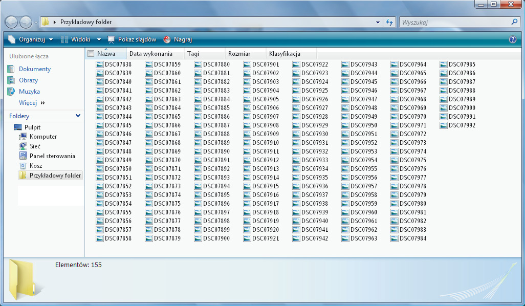 Otwórz folder, w którym przechowujesz pliki o nieuporządkowanych nazwach. Wciśnij skrót klawiszowy [Ctrl]+[A]. Zaznaczysz w ten sposób wszystkie pliki znajdujące się w danym folderze. W naszym przykładzie jest to folder Przykładowy folder zawierający zdjęcia-skany różnych dokumentów (155 plików).