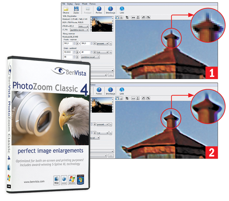 BenVista PhotoZoom Classic 4 jest edytorem cyfrowych fotografii wyspecjalizowanym pod kątem zmiany rozmiarów zdjęć cyfrowych. Z programu można korzystać niezależnie oraz w postaci wtyczki np. do Photoshopa. Obsługa programu jest bardzo prosta. Po otwarciu zdjęcia, którego wielkość chcemy zmienić, program wyświetla parametry fotografii, m.in. wielkość pliku, rozdzielczość obrazu w pikselach itp. Możliwości programu są praktycznie nieograniczone, chyba że ograniczeniem nazwiemy możliwość powiększenia zdjęcia do rozdzielczości 300 tysięcy x 300 tysięcy pikseli…