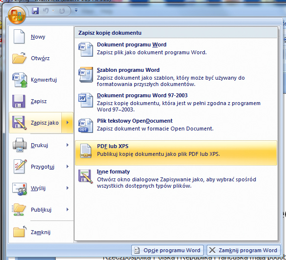 Jeśli eksportujesz plik z MS Office za pomocą poleceń Zapisz jako i PDF lub XPS, w oknie zapisu opcja PDF-u do druku jest wybrana standardowo. Jeśli chcesz użyć pliku w sieci, zaznacz opcję Minimalny rozmiar i kliknij Publikuj.