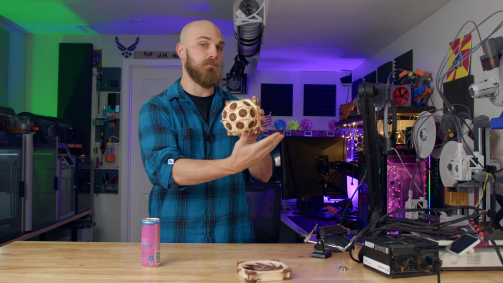 Realizacja tego pomysłu wiązała się jednak z ogromnymi kosztami. Model NF-A12x25 to wydatek rzędu 40 dolarów za sztukę, co przy 15 jednostkach daje kwotę 600 dolarów (ponad 2400 zł) za same wentylatory. Z pomocą przyszła jednak firma Noctua, która objęła projekt patronatem, dostarczając nie tylko sprzęt, ale także filament w swoich charakterystycznych barwach, co pozwoliło stworzyć spójną kolorystycznie kopułę montowaną jako boczna ściana obudowy peceta.