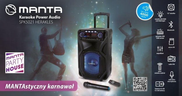 Manta SPK5021 HERAKLES to wielofunkcyjny głośnik karaoke, który urozmaici każdą imprezę. Urządzenie zostało wyposażone w najpopularniejsze źródła dźwięku, takie jak: łączność Bluetooth, gniazdo kart SD czy USB, przez co odtwarzanie ulubionych utworów za pomocą urządzeń przenośnych jest bezproblemowe. Dzięki dużej mocy głośnika 4000W P.M.P.O. i 12-calowemu wooferowi słuchanie muzyki stanie się jeszcze przyjemniejsze. W każdej chwili będzie można też posłuchać ulubionej stacji radiowej.