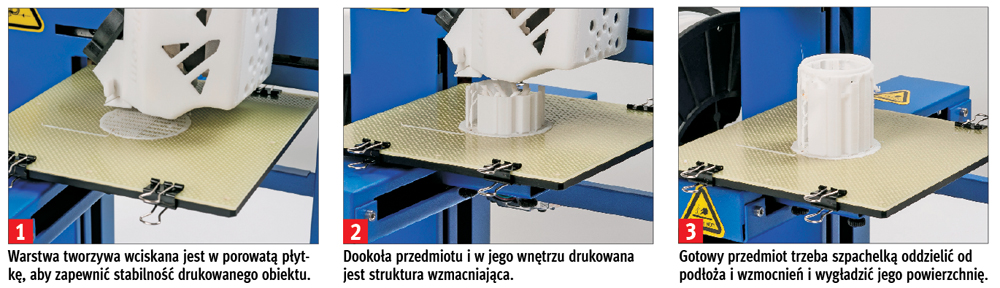 Technologia druku wykorzystywana przez testowane urządzenie polega na termicznym rozprowadzaniu materiału, jakim może być tworzywo ABS lub PLA, na powierzchni ebonitowej płytki roboczej. Sama płytka jest pokryta otworami w celu zwiększenia przyczepności drukowanego modelu do podłoża. Podczas druku głowica drukująca ma temperaturę 260 stopni, a płytka ebonitowa blisko 100 stopni. Proces druku nie przypomina żadnej znanej technologii – głowica nie pluje rozgrzanym materiałem, jak drukarka atramentowa, lecz rozsmarowuje go w postaci kolejnych warstw.